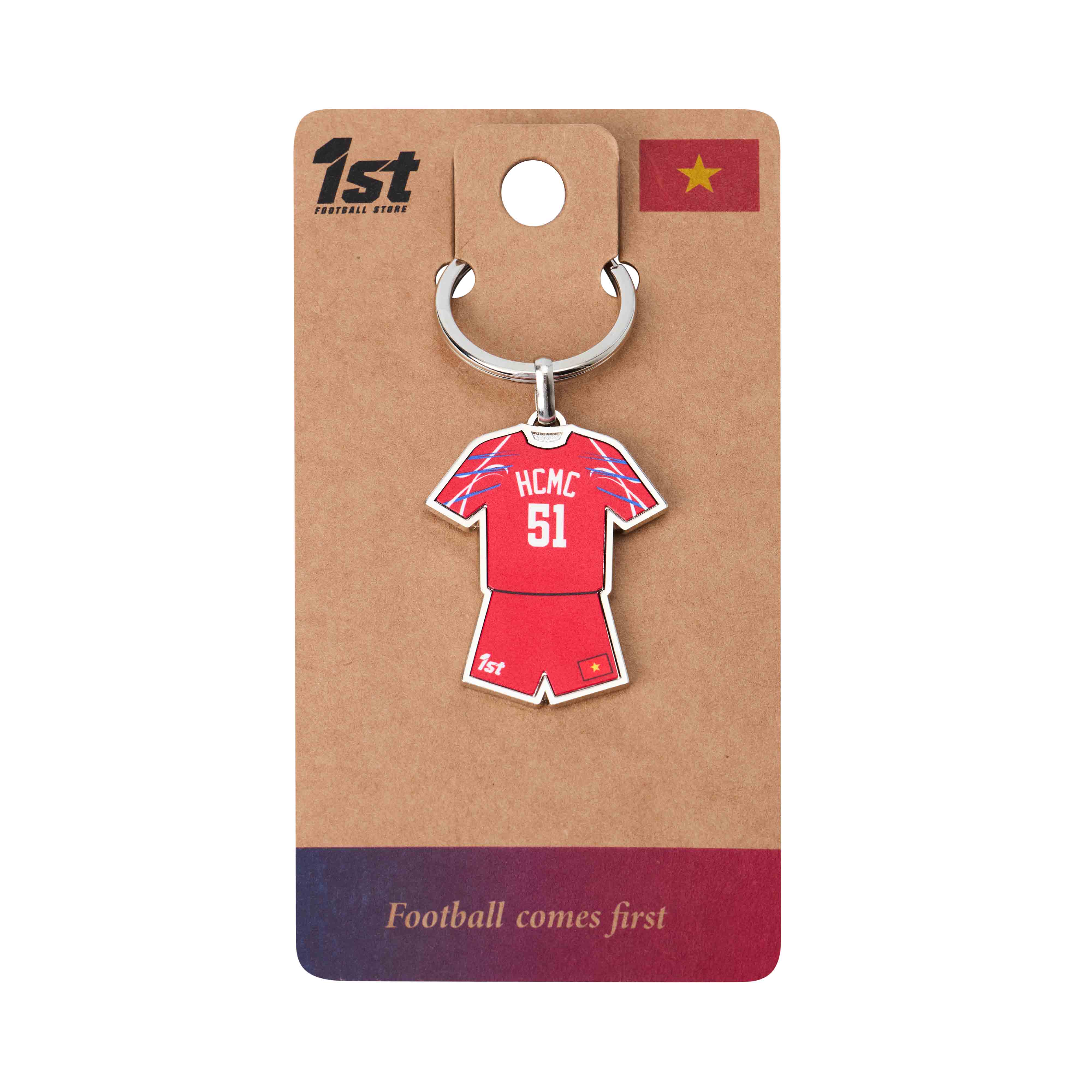 Celebrate Vietnamese football with the 1st Football Store Metal Keychain. UV-printed in jersey style with HCMC FC 2025 jersey design, durable and perfect for keys, bags, gifts, or collections.