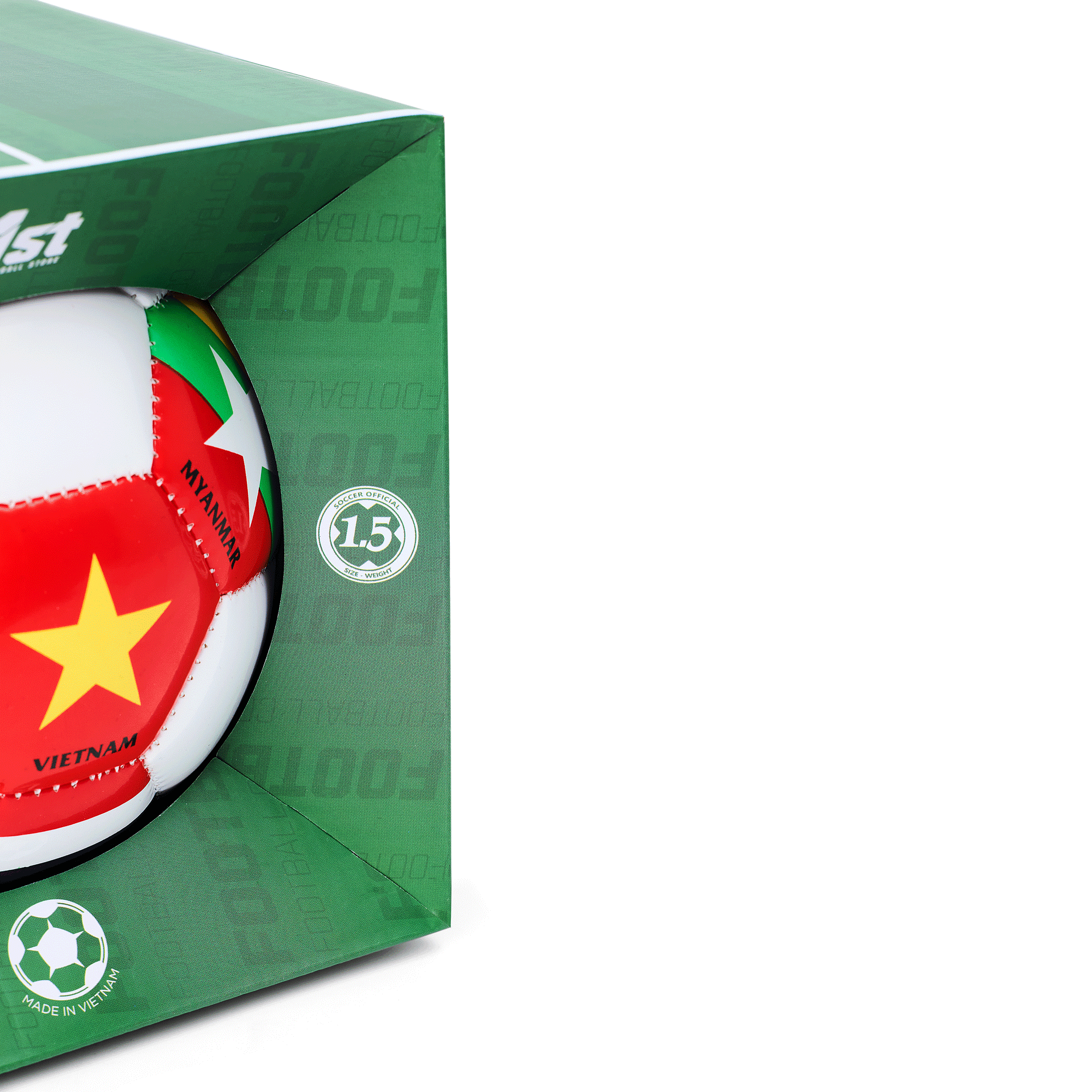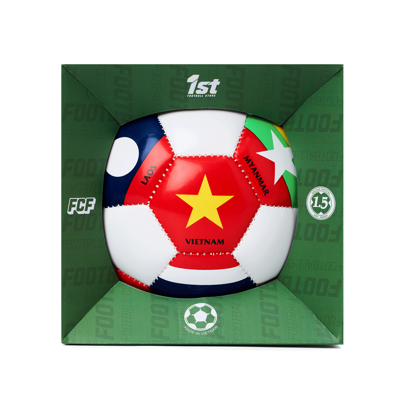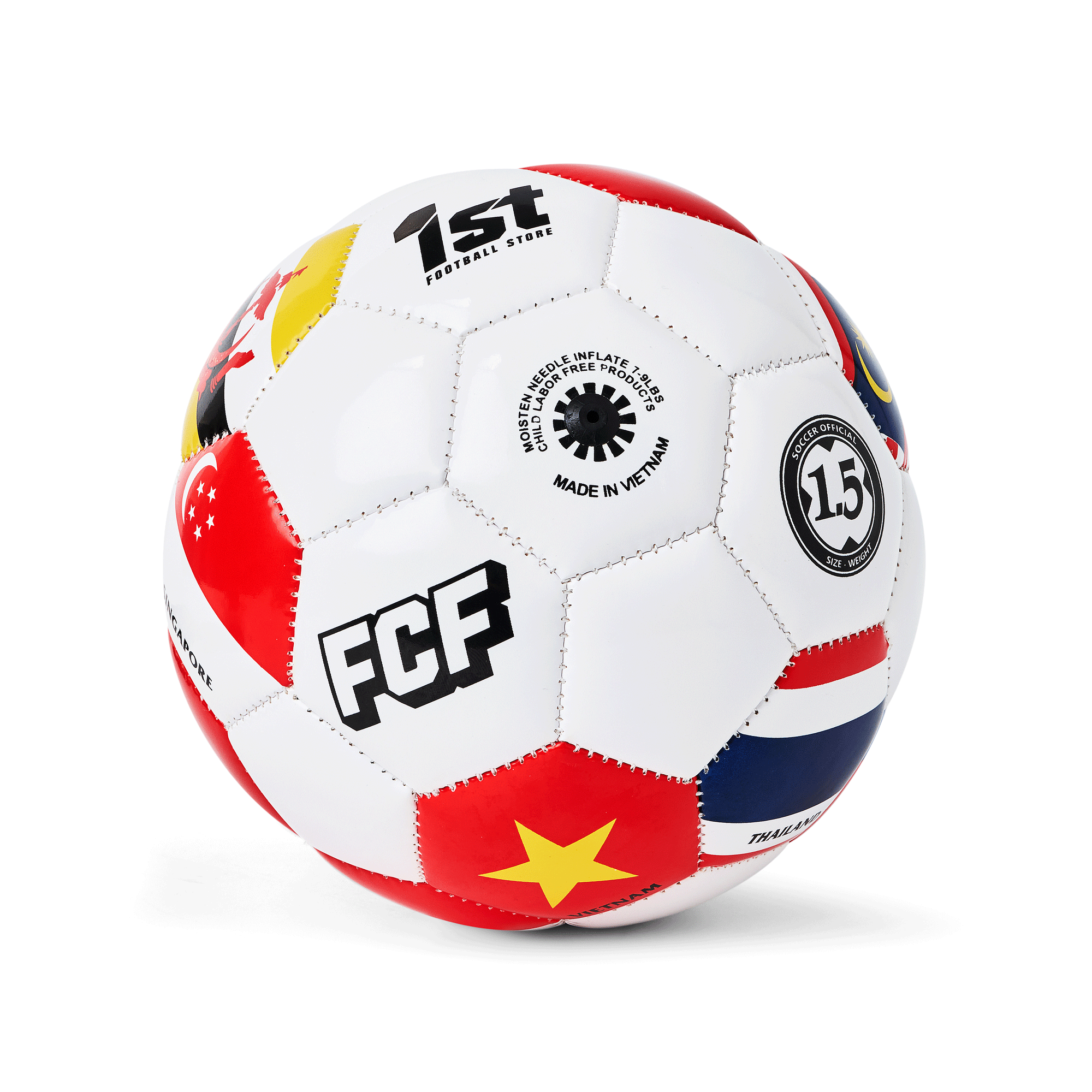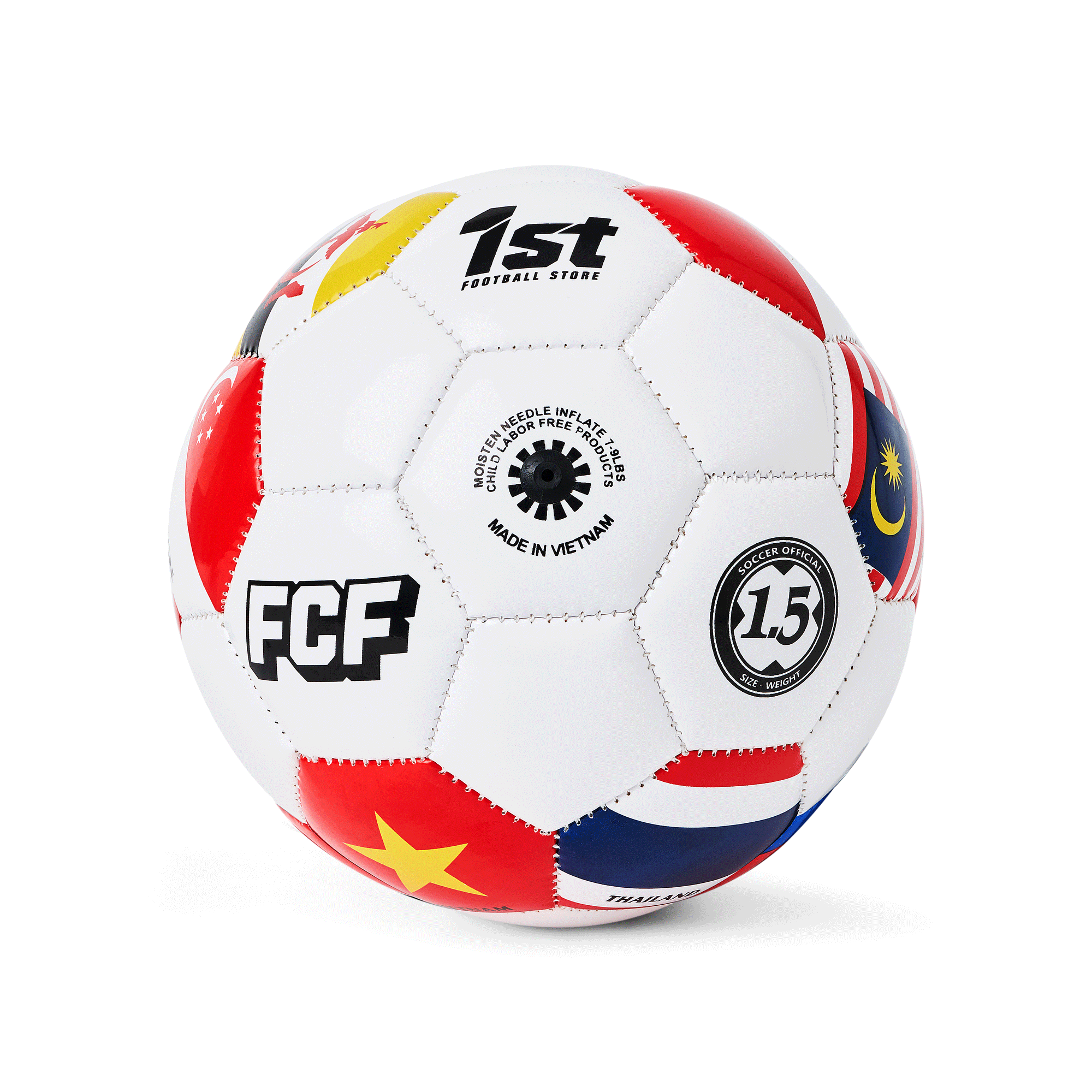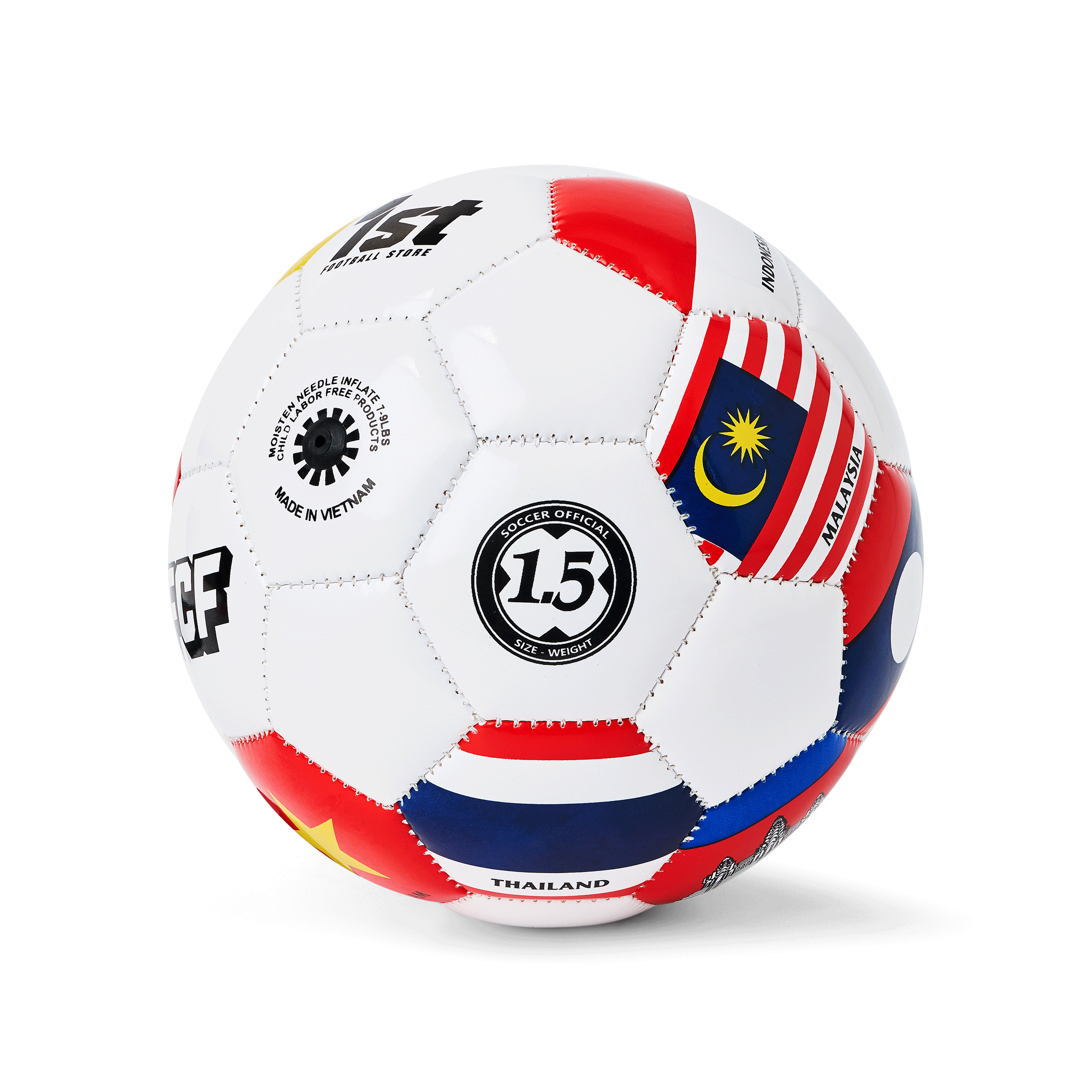Celebrate football passion with the 1st Football Store Mini Ball Size 1.5. Hand-stitched from PVC with a rubber bladder, featuring ASEAN national flags. Perfect for souvenirs, collections, and display.