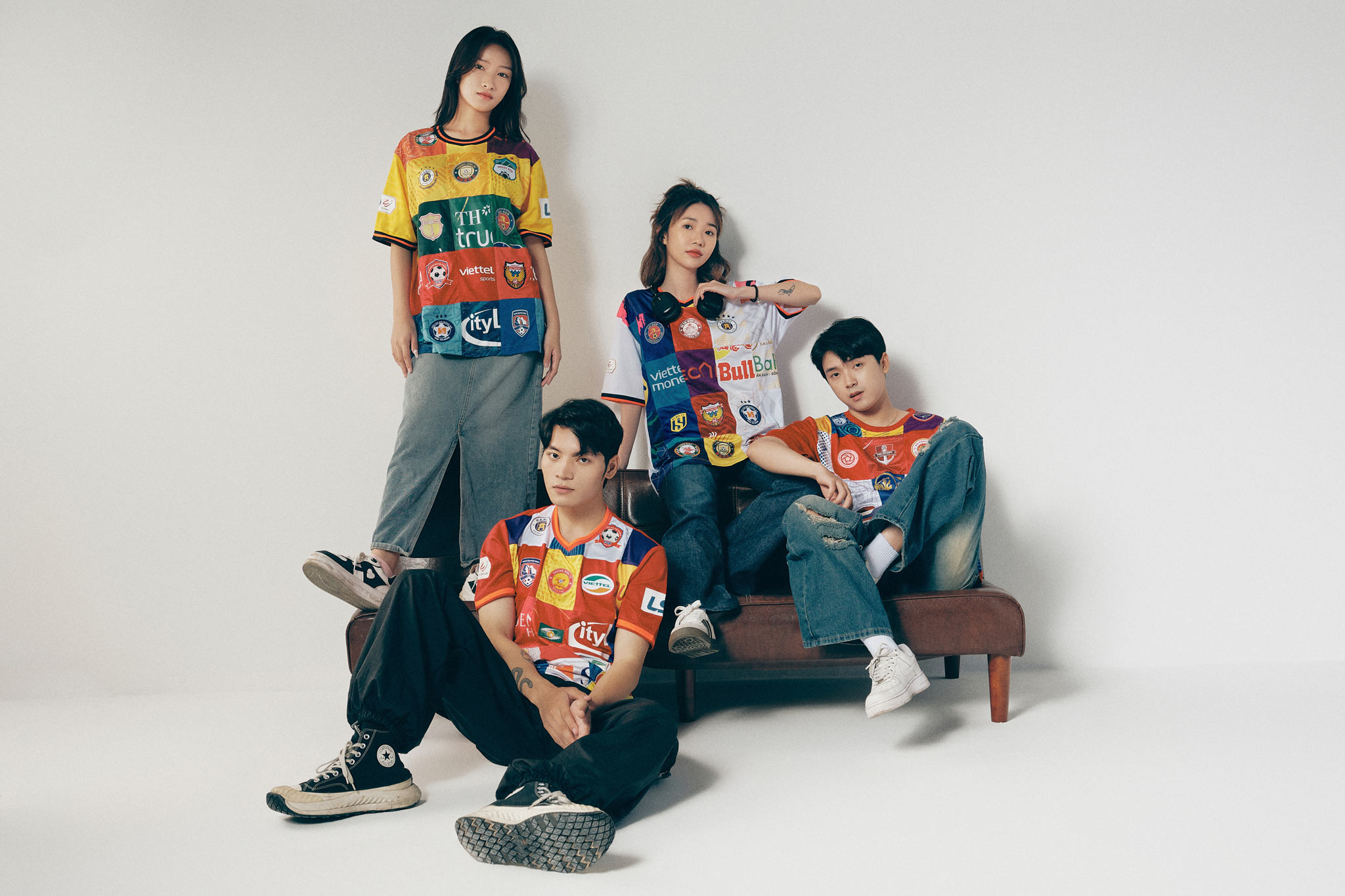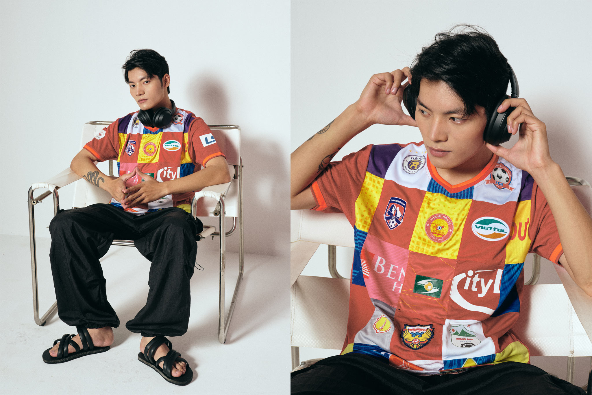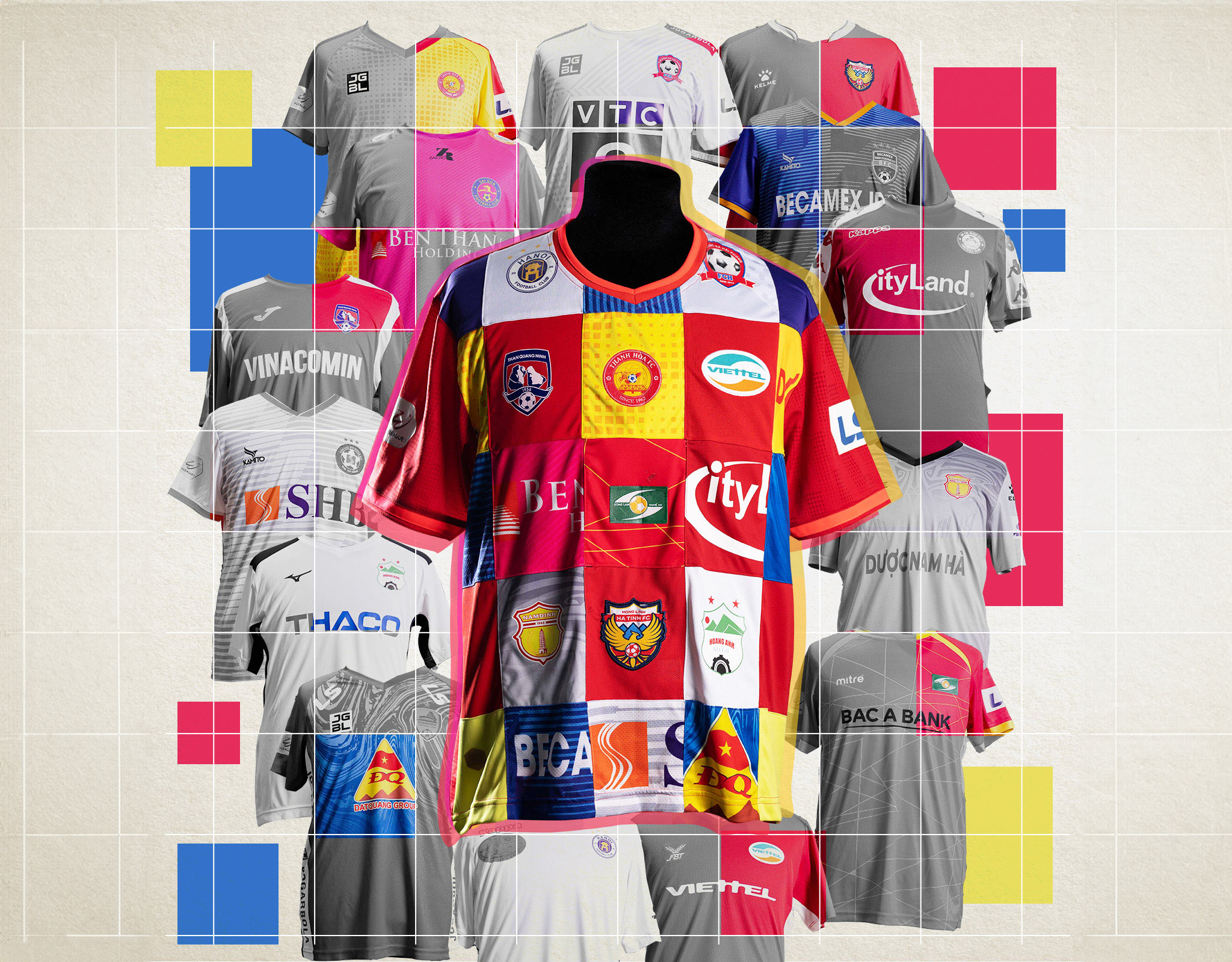 - Mặt trước của áo là sự kết hợp của 25 mảnh áo từ các mẫu sân nhà & sân khách của 14 đội bóng V.League thi đấu trong mùa giải 2020.